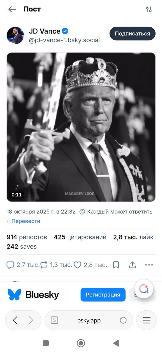 Символические и знаковые события последней недели. 18 октября (19 октября по европейскому времени) 2025 года в 22:32(*), вице-президент США г-н Вэнс разместил в соцсети Blue Sky 19-секундный видеоролик "коронации" г-на Трампа, сгенерированный ИИ. Видеоролик подавался в качестве ответа-троллинга на массовые митинги в США против г-на Трампа, проходившие под лозунгом "No kings" ("Нет королям"/"Никаких королей"). (*) Код 23, как составляющая и реверс оккультного кода 322 (общество "Черепа и костей", основанного в американском Йельском университете). 22 - число букв в еврейском алфавите и удвоение оккультного числа 11. 19(*) октября 2025 года произошло ограбление Музея Лувра. Злоумышленники(**) похитили 8(***) королевских и императорских реликвий из 23(****) предметов коллекции французской короны, хранившихся в галерее Аполлона, древнегреческого божества, прозванного Фебом ("лучезарным", "сияющим", "светоносным"), что, несомненно, отсылает к Сатане-Люциферу-Деннице. (*) Код 19 являетс