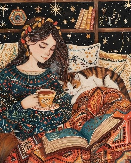 Милый котик с картины художницы, которая работает под именем virtualfeline, желает всем спокойной ночи и прекрасного дня! 🩷☘️