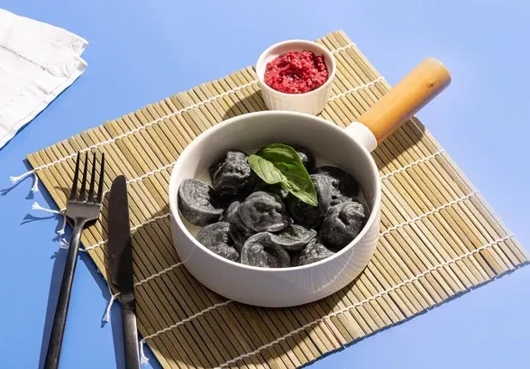 2. Муку и соль смешайте с желтками, затем добавьте угольную воду, замесите тесто, заверните его в плёнку и дайте отдохнуть в холодильнике хотя бы полчаса.