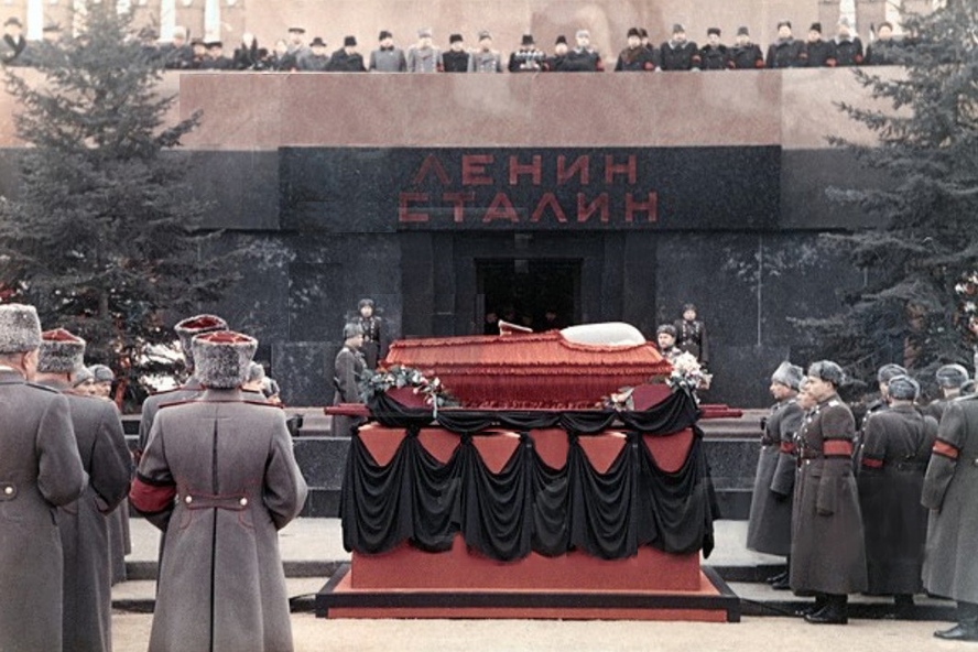 9 марта 1953 года тело Иосифа Сталина, которое забальзамировали после его смерти, положили в Мавзолей Ленина. С этого момента Мавзолей стали называть «Мавзолей В. И. Ленина и И. В. Сталина».В 1961 году тело Сталина вынесли из Мавзолея. На XXII съезде партии, который прошел 30 октября 1961 года, решили похоронить Сталина. Ночью с 30 октября на 1 ноября работники спецслужб и сотрудники Мавзолея забрали тело из саркофага.1 ноября, около 18:00, останки Сталина положили в деревянный гроб, обитый черной тканью. К тому времени шесть солдат выкопали яму под Кремлёвской стеной. Они принесли туда гроб и похоронили Сталина.Сначала на месте могилы поставили простую плиту из белого мрамора с именем и годами жизни Иосифа Виссарионовича. Позже, в 1970 году, её заменили на бюст, который можно увидеть и сейчас. В марте 1953 года смерть Сталина вызвала шок и плач среди школьников.В Москве произошла давка на Трубной площади, погибли люди.Тело Сталина положили в Мавзолей рядом с Лениным. Глубокую могилу в