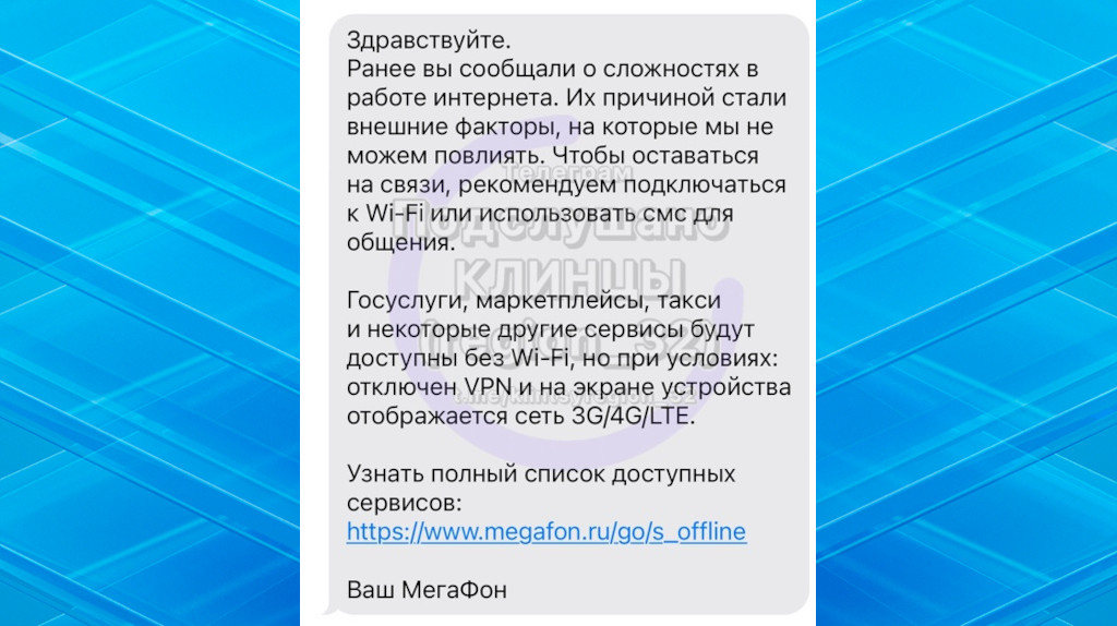 Вслед за Брянском город Клинцы испытывает проблемы с доступом в Интернет с мобильных устройств. Клинчане стали получать SMS-сообщения о временных сложностях с оказанием этой услуги. Однго из таких уведомлений опубликовано в городском телеграм-канале.