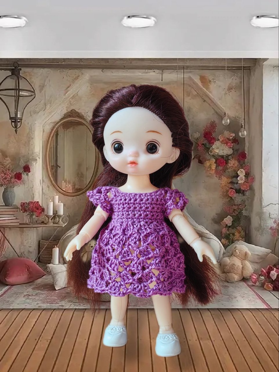 Дорогие друзья! Рада приветствовать всех ценителей кукольной моды и гостей моего канала! Сегодня я поделюсь с вами пошаговым мастер-классом по вязанию очаровательного платья для куколки Baboli. Этот мастер-класс идеально подойдёт даже для тех, кто только делает первые шаги в вязании крючком! Материалы и инструменты Для создания этого чудесного платья вам понадобятся: Сокращения: В.П. - воздушная петля ССН - столбик с накидом ПР. П. - пропустить петлю П. - петля СС - соединительный столбик Ар. - арка Приступим к созданию нашего волшебного платья! В процессе мастер-класса я подробно расскажу о каждом этапе работы, дам полезные советы и поделюсь секретами, которые помогут вам создать настоящее произведение искусства. Ряд 1 – Набрать 25 в.п, со 2 п. от крючка СБН в след. 3 п., 3 СБН в след.п., СБН в след. 4 п., 3 СБН в след.п., СБН в след. 7 п., 3 СБН в след.п., СБН в след. 4 п., 3 СБН в след.п., СБН в след. 3 п., в.п., поворот Ряд 2 – СБН в след. 5 п., 5 в.п., пр. п., СБН в