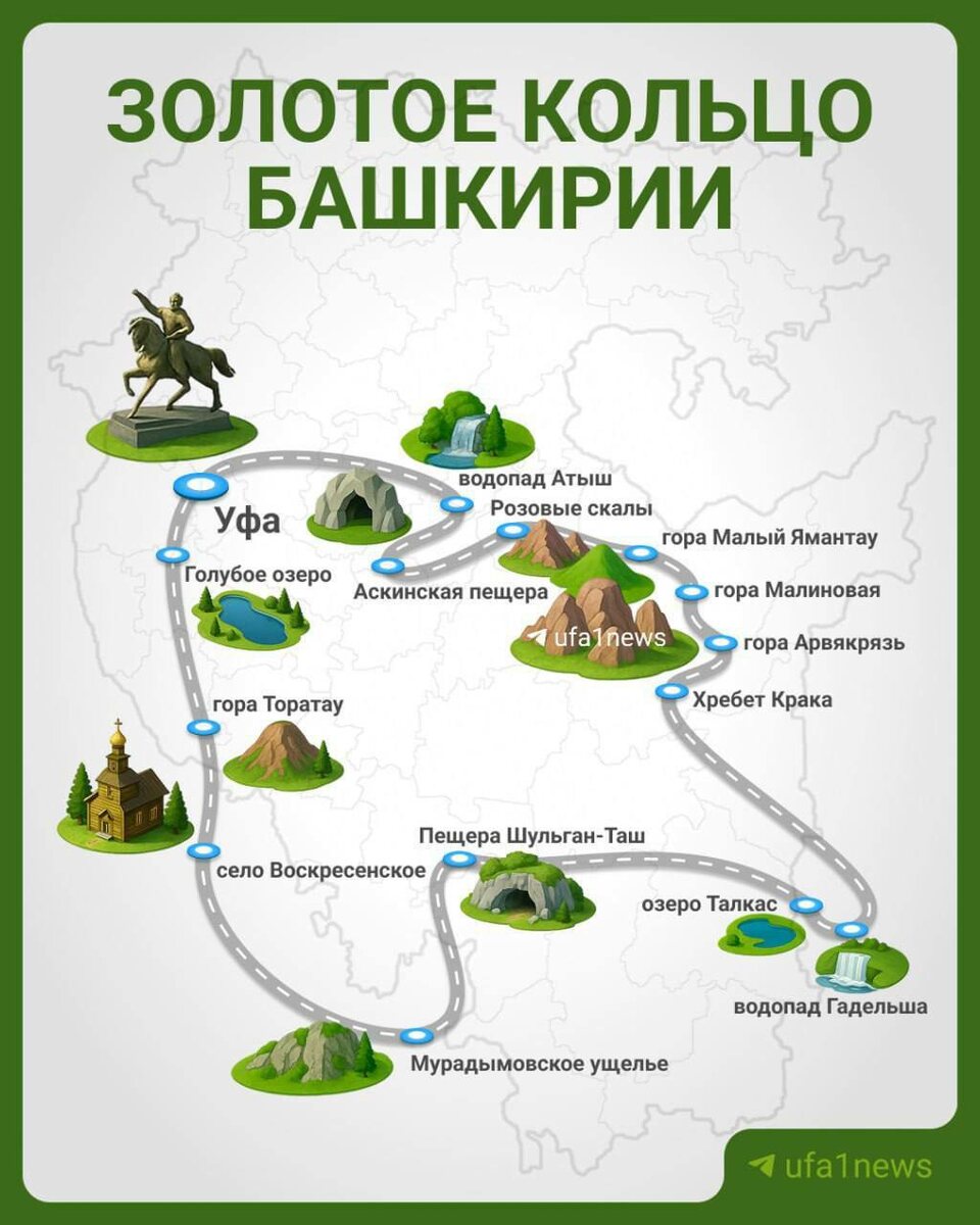 В Башкортостане начинается масштабное обновление маршрута «Золотое кольцо Башкирии» Более 60 миллионов рублей направят на развитие придорожной инфраструктуры: появятся кемпинги, спортплощадки, парковки и зоны отдыха для семей с детьми. Проект включен в национальную программу «Туризм и гостеприимство» и станет частью федеральной инициативы по созданию пилотных автотуристических маршрутов. Маршрут протяженностью почти тысячу километров соединит главные природные и исторические объекты республики — Голубое озеро, Мурадымовское ущелье, пещеру Шульган-Таш, водопад Гадельша и озеро Талкас. Путешествие рассчитано на три дня и уже отмечено на Яндекс.Картах, что делает путь удобным для самостоятельного планирования. Инвестиции распределят в течение трех лет — с 2025 по 2027 годы. Средства пойдут не только на строительство, но и на благоустройство дорог, установку навигационных указателей, а также развитие точек с местной кухней. По словам экспертов, обновленный маршрут способен стать новым др