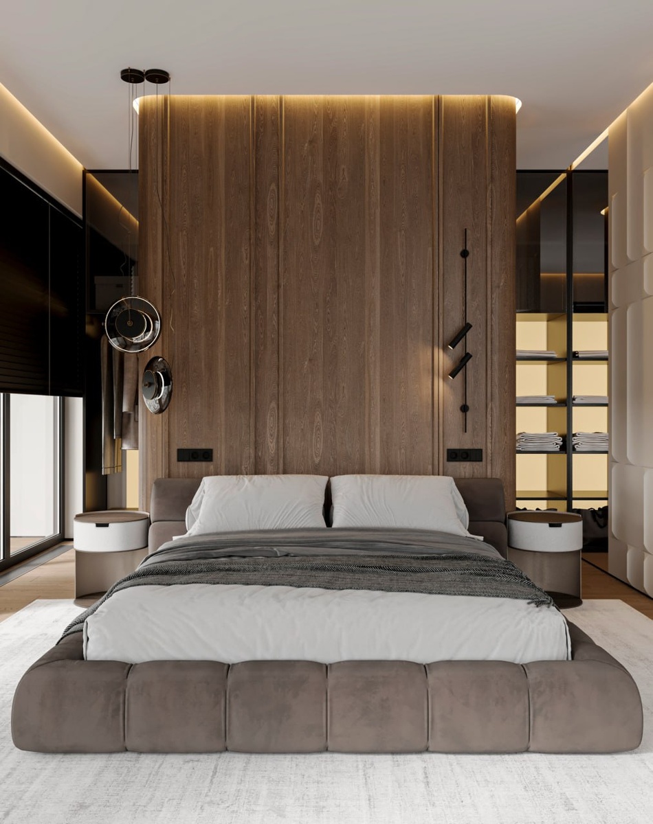 #KRASNOV_VictoryPark Это мастер-спальня, где всё продумано для ощущения покоя. Основа — спокойная палитра с мягкими контрастами: тёплое дерево, светлые стены и акценты в графитовом металле. Изголовье и кровать выполнены в велюре сложного серо-кофейного оттенка — фактура «гасит» свет, делает интерьер уютным. Панель за кроватью отделана шпоном, а светильники выбраны контрастные: металл и стекло. Они не просто источник света, а акцент, подчеркивающий архитектуру стены. Радиусная перегородка мягко завершает пространство — благодаря округлой форме она не «разрезает» комнату, а плавно направляет взгляд. В таких помещениях важно, чтобы линии не обрывались резко — поэтому радиус здесь работает на ощущение целостности и комфорта. Хочу так же