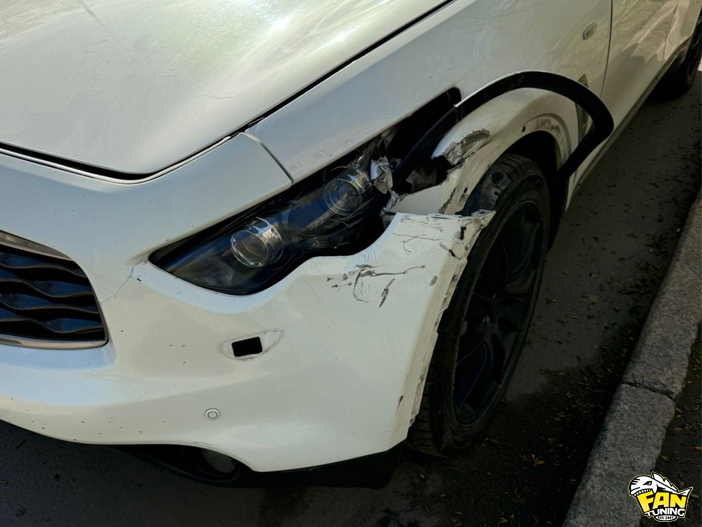 Бывают в жизни небольшие неприятности в виде #ДТП, но это не повод для грусти, но повод для #тюнинга. Вот такое небольшое ДТП случилось с этой #Инфинити (#Infiniti) #FX37 Владелец решил не просто сделать #кузовной #ремонт, но и преобразить внешность своего Инфинити. Был выбран #бампер #Ренегат в легкой версии (без расширения), куплено новое #крыло и #расширитель колесной арки. Мы всё это собрали, окрасили в белый #перламутр (достаточно сложная трехслойная покраска) и установили на автомобиль.