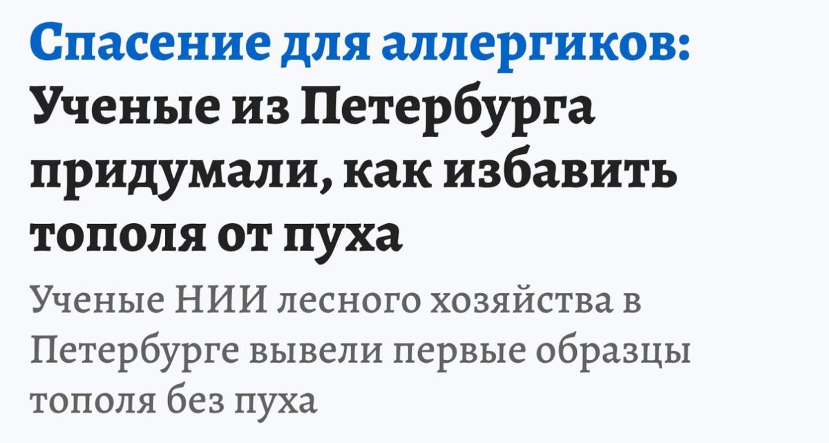 🌳 Учёные нашли способ навсегда избавиться от тополиного пуха Петербургские биологи впервые отредактировали гены тополя, «выключив» часть ДНК, которая отвечает за цветение. После такой обработки деревья больше не образуют пух, но продолжают расти и очищать воздух. Метод не делает растения ГМО — в них не добавляют чужие гены, а лишь ускоряют естественные мутации. Первые нецветущие клоны уже готовы к высадке, и города смогут вздохнуть свободнее.