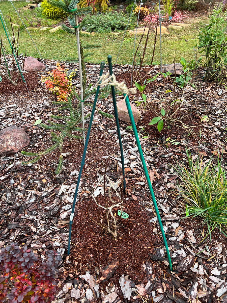 Сегодня ударно поработали. Погода позволила быть весь день на улице. Зарядят дожди, похолодает и мне останется только укрыть оставшееся. Из палок поставили опоры. Вот эта Гортензия посажена весной из р9. Сейчас собралась цвести, но уже поздно. Пора готовится к спячке, поэтому все бутоны убрала руками, не обрезала, ошмыгала )). Побеги не очень хорошо вызрели, кончики мягкие, поэтому укрою колпаком на зиму, ну и от поломок тоже. Связываю, отодвигаю от ствола мульчу, ствол не должен гнить в мокрой коре. Укрою при устойчивых морозах и снегопадах. Там, где есть опасность схода снега, а эта гортензия под ветками сосны и с нее падает сразу сугроб, связываю слегка, просто чтобы ветки не разложились по бокам. Стягивать сильно не нужно Останется только надеть колпак Есть у меня один очень не помлушный кустик Гортензии Скайфолл, которая просто застыла в одной позе - я цвету и мне все равно. Но нет, пора готовится к зиме и набираться сил, поэтому все соцветия и листья оборвала. В следующем году