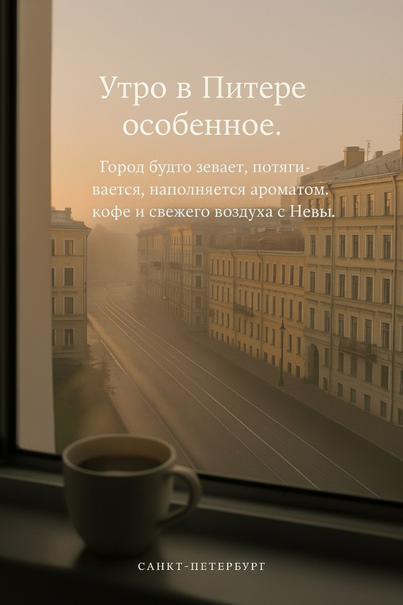Есть в Петербурге особый, почти мистический час. Время, когда туристы еще спят, витрины только протирают, а воздух свеж и прозрачен, словно хрусталь. Это питерское утро — возможно, самое честное и настоящее время суток, когда город сбрасывает с себя парадный фрак и позволяет заглянуть себе в душу. ☕ Первый вздох: город зевает и потягивается Представьте: вы выходите на улицу. Еще нет навязчивого гула машин, нет толчеи на Невском. Город будто зевает, лениво и с наслаждением. Из открытых дверей булочных и кофеен тянет аромат свежеиспеченных круассанов и только что смолотых зерен. Этот запах смешивается с влажной прохладой, что несет с Невы, создавая тот самый, ни на что не похожий утренний коктейль Питера. Где-то вдали лениво звенят трамваи, их перезвон кажется особенно мелодичным в утренней тишине. Первые прохожие — не спешащие туристы с картами, а местные жители. Они идут на работу, погруженные в свои мысли, и в их шаге нет суеты. Они — часть этого пробуждения. 🌫️ Магия света: солнце,
