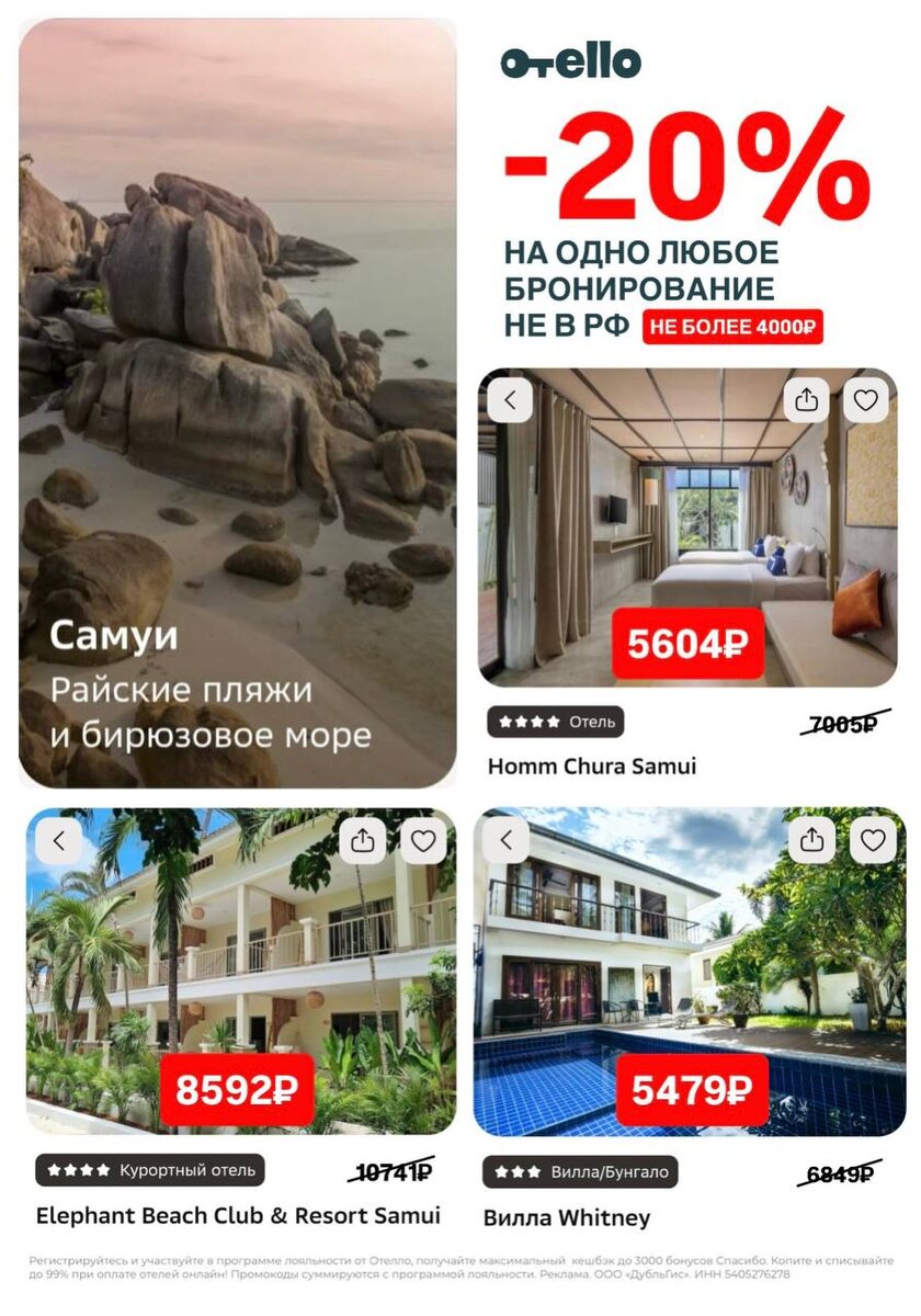 WD771 — скидка 20% на одно любое бронирование отеля не в РФ, но не более 4000₽