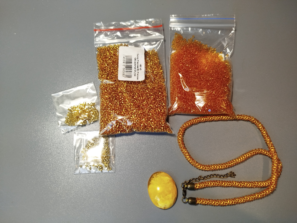 Приветствую Вас на моем канале! В одной из прошлых статей я показывала вам, как сплести жгут из бисера на 5 бисерин. Если пропустили, то почитать можно ниже. Я говорила, что такие жгуты плету, как правило, для кулонов. И я обещала вам показать кулон к этому жгуту. Обещания надо выполнять!) А заодно покажу вам интересную технику оплетения кабошонов. Начнем?) Для работы я возьму чешский бисер нескольких цветов, кабошон (камень) из янтаря, синтетические нитки и тонкую иголку. Хочу отдельно показать вам кабошон. Это натуральный янтарь, размера 3*2см, 0,7см в толщину, невероятно красивого цвета! Вы только посмотрите на эту красоту, какие переливы цвета! Оплетать кабошон я буду бисерной сеткой. Никакие отверстия в камне я не делаю!!! Клей тоже не использую. Всё крепление исключительно за счет фиксации камня в сетке. Итак, я плету бисерную сетку. В прошлых статьях я уже подробно показывала процесс плетения. Как обычно, в начале плетения оставляю небольшой кусок нити 10-12 см. Набираю 9 бисе