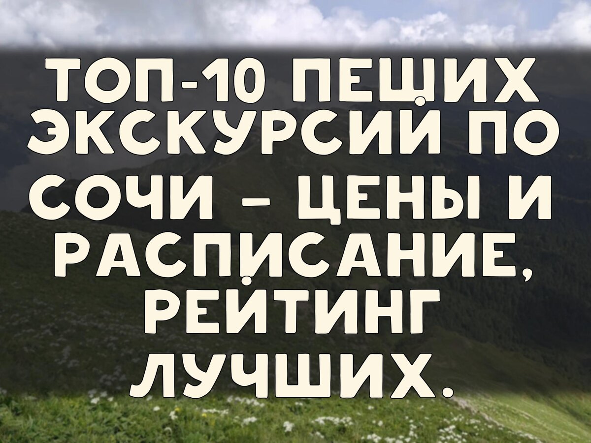 Вот краткий список экскурсий, вошедших в наш рейтинг: "Обзорная по Сочи: история и природа", "Треккинг по хребту Аибга на перевал Седой", "Пеший подъём на Хмелёвские озёра через водопад Кейва", "По страницам истории города Сочи", "Пешком по Сочи сквозь века", "Вечернее театрализованное путешествие с Фаролеро по Сочи", "Треккинг по хребту Аибга в Сочи", "Трекинг к водопаду Кейва в Красной Поляне", "Краснополянский Голливуд: аудиоэкскурсия по местам съемок фильмов в Сочи", "Пленэр — пишем картину своими руками".