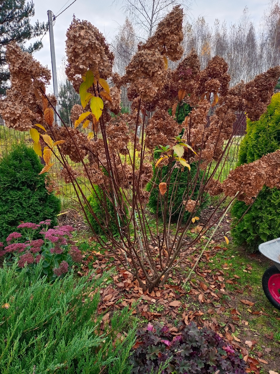 Позади шикарное цветение гортензий. Пришла пора готовить красоток к зимовке. Их коричневые шапки давно уже грустно раскачиваются от назойливого осеннего дождя. В зиму я их не оставляю, не хочу рисковать веточками. Ведь от снега ветки может поломать. Но не только соцветия я срезаю. Осенью провожу полную обрезку, как санитарную, так и формирующую. Почему не весной? Объясню! Зимы у нас бывают разные, и снежные и совсем без снега. Да и вёсны последние годы, мягко говоря, чудят! Зачастую, тепло весной обрушивается очень рано, провоцируя сокодвижение. Мне, дачнику выходного дня, трудно поймать нужное время для обрезки. Немного опоздал и сокодвижение пошло. А рано обрезать тоже бывает проблематично. Это в случае высоких снегов по весне. Поэтому я и выбрала для этой процедуры осень. Начинаю с удаления шапок. Так лучше видно, что резать дальше. Скажу сразу, что никакие почки я не считаю. Режу так, что бы получился гармоничный куст. За лето гортензии сильно загущаются, нарастает масса мелких
