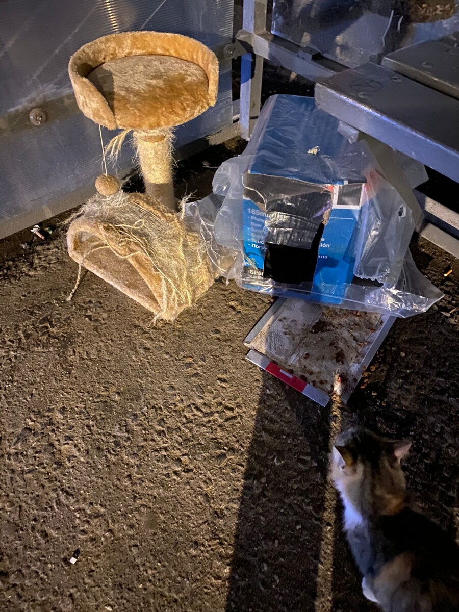 На остановке в Кашира-1 живет кошечка, люди видно принесли игрушку, сделали из коробки ей домик ( внутри куртка лежит), кладут корм. Кошечка - беременна, животик уже не маленький.