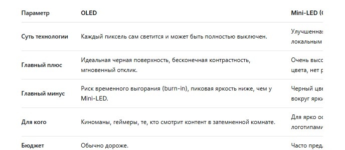 Вердикт: Если вы цените кинематографичное изображение выше всего — ваш выбор OLED. Если вам нужна максимальная яркость и вы не хотите переживать о выгорании — ваш выбор Mini-LED.