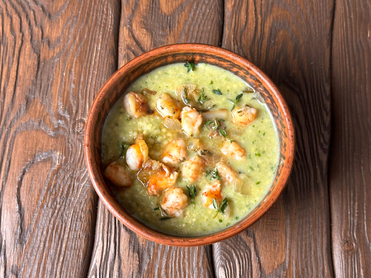Есть блюда, которые будто созданы для неспешных вечеров, когда за окном моросит дождь, а на кухне пахнет тёплым бульоном, зеленью и чем-то сливочным. Недавно я решила приготовить ризотто… но не из риса, а из пшена. Да-да, того самого, которое мы привыкли видеть в кашах. Но с правильным сочетанием ингредиентов пшено превращается в изысканное, мягкое и невероятно уютное блюдо, особенно, если добавить к нему креветки и немного песто. Во-первых, оно богато магнием и кремнием - помогает нервной системе и поддерживает здоровые волосы и кожу. Во-вторых, в нём меньше крахмала, чем в рисе, поэтому блюдо получается лёгким, но сытным. Чтобы не утяжелять блюдо, я сделала бешамель в легком варианте. Без сливочного масла и муки, на молоке с ложкой крахмала. Получается нежно и без лишнего жира. А вместо дорогого пармезанового песто - мой бюджетный вариант: базилик, подсолнечные семечки, чеснок и оливковое масло. Простой, ароматный и очень живой вкус. Пшено впитывает аромат розмарина и чеснока, соус д