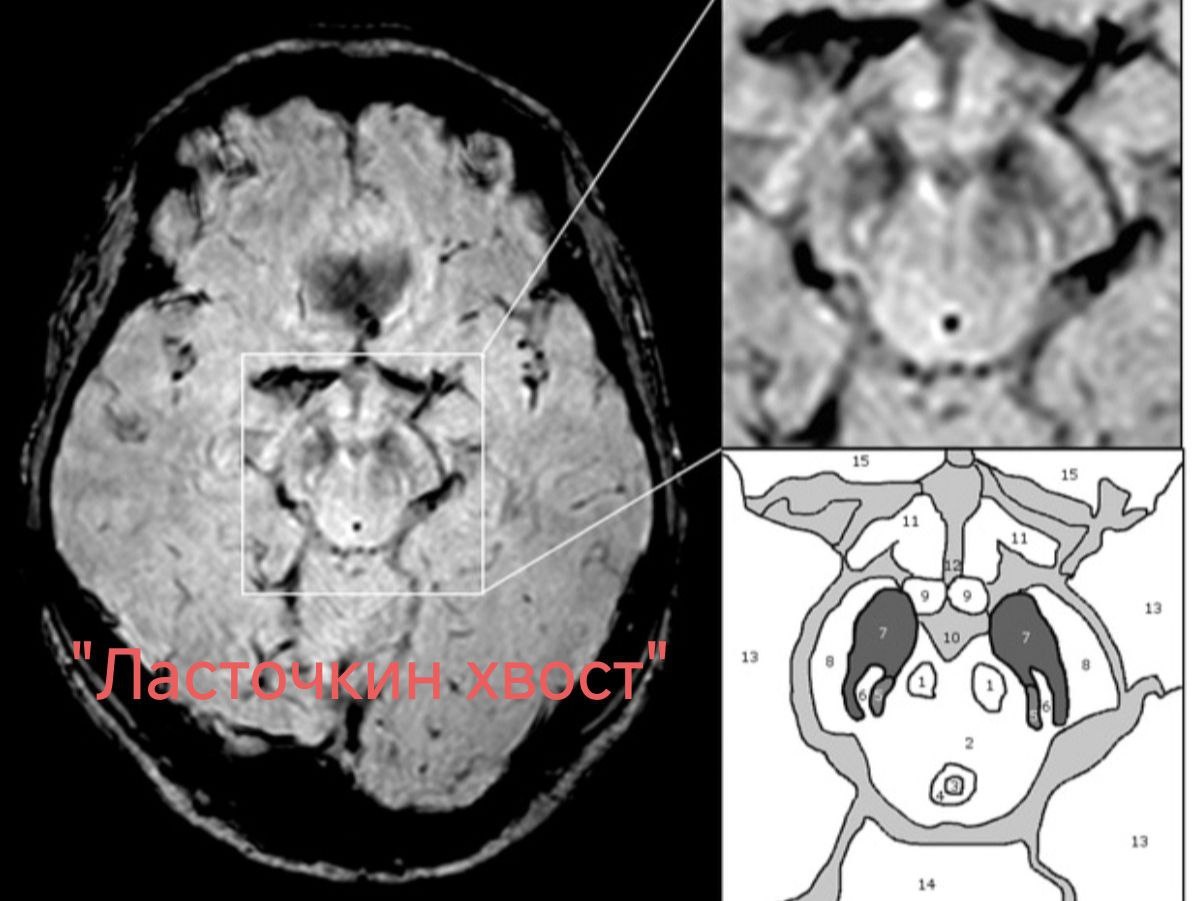 О ласточках и нейродегенерации 💬 📌 Болезнь Паркинсона - нейродегенеративное заболевание с поражением нигростриарных нейронов и нарушением функции базальных ганглиев. Конечным звеном патологических процессов при данной болезни является уменьшение продукции дофамина. Может ли рентгенолог увидеть изменения, характерные для этого заболевания? 🟢 Может. Для этого нужен аппарат МРТ 3 Тесла и ИП SWI. 🖥 Нигросома-1, расположенная в задней трети чёрной субстанции, имеет высокий МР-сигнал на SWI в аксиальной плоскости в форме запятой или запятой с отростком. В сочетании с низкой интенсивностью МР-сигнала по SWI спереди, сбоку и медиально, имеется сходство с характерным раздвоенным хвостом ласточки. При болезни Паркинсона происходит потеря нигросомы-1, и на этом основании отсутствие симптома «ласточкин хвост» может быть полезным МР-признаком, специфичным для этого заболевания. --------------------------------------- Больше материалов для студентов медицинских Вузов тут.