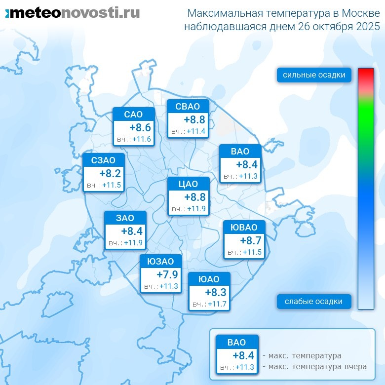 Самая высокая температура +8.8°C была зафиксирована в 16 часов в центре города, а холоднее всего было на юго-западе: +6.4°C. Разница по максимальной температуре в разных частях столицы составила за день 2.4°C.