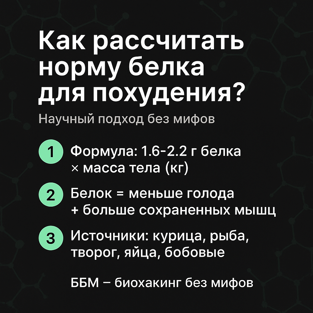 Главный тезис: Без достаточного количества белка похудение превращается в потерю мышц, а не жира. Белок помогает сохранить мышечную массу, уменьшает аппетит и повышает термический эффект пищи (то есть требует больше энергии на переваривание). 🔬 Что говорит наука 📚 Согласно мета-анализу 2023 года (Journal of Nutrition, PMID: 37319422): люди, потреблявшие 1.6–2.4 г белка на кг массы тела, теряли больше жира и сохраняли больше мышц по сравнению с теми, кто ел меньше 1.2 г/кг. 📖 Американский колледж спортивной медицины (ACSM, 2022) рекомендует: при снижении веса — 1.6–2.2 г/кг массы тела, при активных тренировках или высоком проценте мышц — до 2.4 г/кг. 🧮 Как рассчитать свою норму 1️⃣ Определи свою массу тела. Допустим, ты весишь 70 кг. 2️⃣ Умножь на коэффициент 1.6–2.2 (в зависимости от активности). 👉 70 × 1.8 = 126 г белка в день 3️⃣ Распредели на 3–5 приёмов пищи. Пример: ~25–30 г белка на приём. 🍳 Примеры продуктов Кол-во белка на 100 г Куриная грудка - 31 г Яйцо (1 шт.) - 6