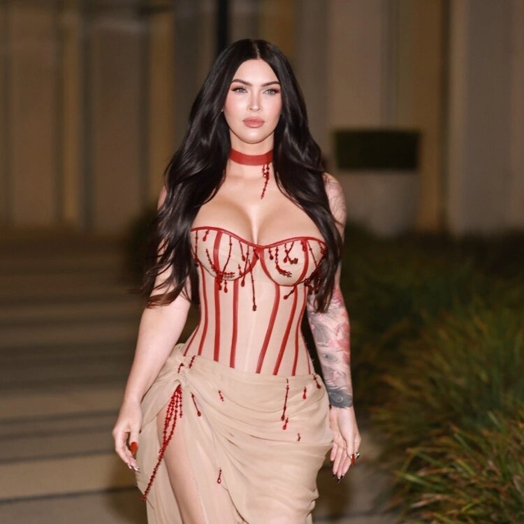 Меган Фокс вышла в свет в откровенном платье с красными нитями. 39-летняя актриса показала фигуру через восемь месяцев после четвертых родов.