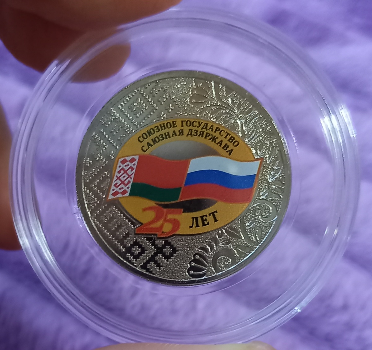 Описание дизайна: Монета отличается оригинальным оформлением. Лицевая сторона традиционно содержит изображение Государственного герба Российской Федерации, название государства и номинал монеты. На обратной стороне размещён сюжет, символизирующий союзное государство, подчёркивающий единство и взаимодействие России и Беларуси. Краткая Характеристика: Номинал - 25 рублей Год выпуска - 2024 Монетный Двор - ММД Исполнение - цветная, в официальной капсуле Гознака Диаметр монеты - 27 мм Вес монеты - 10 г. Тираж - 50 000 шт. Материал: медно-никелевый сплав Договор о создании Союзного государства был подписан в декабре 1999 года, и спустя четверть века, в 2024 году, отмечается важная годовщина. Этот документ стал основой дальнейшего развития взаимовыгодного сотрудничества и интеграции двух стран. Исторический контекст: Подписание Договора о создании Союзного государства было важным событием, укрепляющим сотрудничество и дружбу между двумя братскими народами. Эта памятная монета служит свое