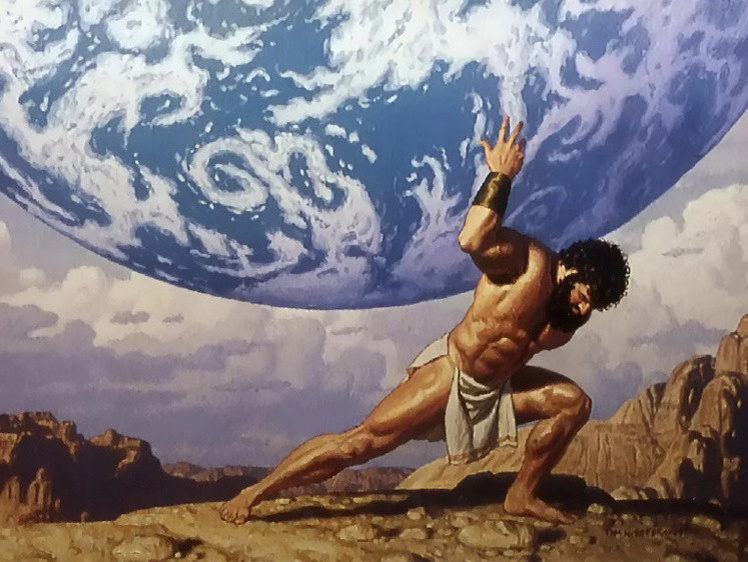 После победы олимпийских богов в битве титанов Зевс оставил на земле только Атланта, которому возложил на плечи и голову небесный свод – это было наказание за то, что вместе с другими титанами он не поддержал восстание против богов Олимпа Очень долгие годы держал на своих плечах Атлант весь мир, тяжесть которого была также велика, как сам мир. Невзгоды этого мира были так велики, что гигант порой не мог сдержать слез и стона. Его сердце переполнялось грустью и печалью, но он беззаветно выполнял свой долг. Ни разу он не позволил себе расправить спину, поднять голову и посмотреть на небо. Он боялся уронить свой бесценный груз. Однажды мимо него проходила прекрасная дева, которая несла вкуснейшие яства и вино. - Почему ты грустишь? - спросила она. «Подними глаза в распахнутое небо, загадай все то, о чём мечтаешь ты…» Ешь, пей, расправь плечи наслаждайся жизнью. - Не искушай, уходи и не отвлекай меня. Я должен удержать всю тяжесть этого мира и не должен отступить от возложенной на меня мис