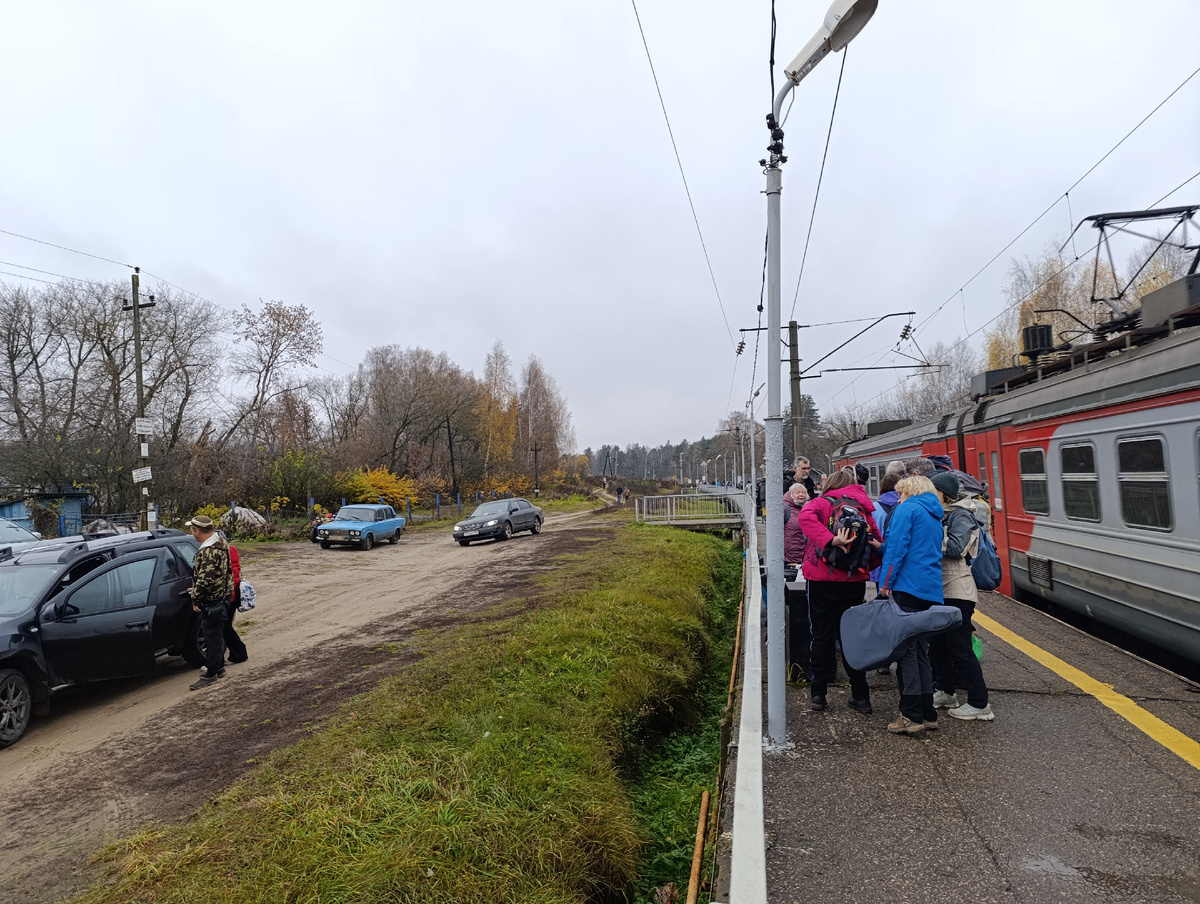 В субботу 25 октября было пасмурно. Погода была на грани дождика. Тем не менее, в электричке на 11:30 было очень много народа. В Рекшино сошла большая компания предпенсионного возраста с гитарами и большими рюкзаками. В такую промозглую погоду люди решились пойти в поход!