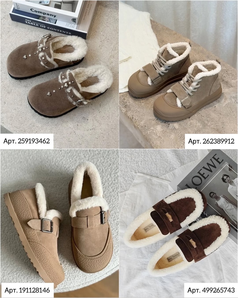 Зима — это не только пуховики и варежки. Настоящее ощущение уюта начинается с тёплой пары на ногах: мягкого меха, правильной подошвы, устойчивой колодки и приятного цвета. Я собрала двенадцать удачных моделей из спокойной бежево-карамельной палитры. Идём строго по порядку, как на фото: артикул — подробное описание — совет стилиста.