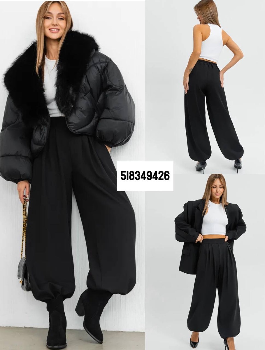 - База: брюки-шаровары 518349426 + костюм 301026149 — два сценария низа: «умный релакс» и спорт-шик.