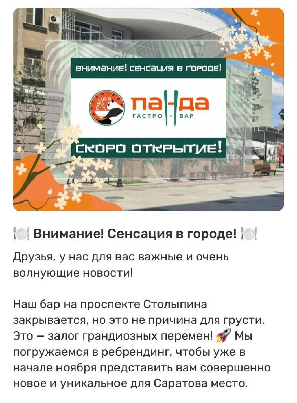 На месте бара Vodolaz на Столыпина, 2 откроется азиатский гастробар «Панда». Я так понимаю, владельцы прежние. Информация из Uds «Водолаза». #саратовоткрылось