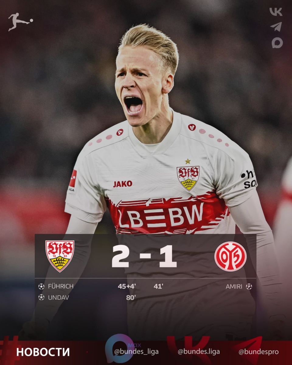 #Бундеслига ⚽️ 8 тур. «Штутгарт» - «Майнц» 2:1 ⚽️ 41' Надим Амири пен. (0:1) ⚽️ 45+4' Крис Фюрих (1:1) ⚽️ 79' Дениз Ундав (2:1) ⚡️«Штутгарт», который до этого матча выиграл в Бундеслиге четыре матча подряд при этом пропустив лишь 1 раз, - сегодня побели и у «Майнца» «Швабы» третьи в таблице Бундеслиги после 8 туров с 17-ю очками, футболисты «Майнца» имеют в своём активе всего 4 очка и находятся в зоне стыков на вылет на 16-й строчке. ⏳ В 9 туре футболисты «Штутгарта» в гостях сыграют с «РБ Лейпциг», а «Майнц» примет «Вердер». ⭐️ MAX /// Видео+ ❤ Телеграм /// Аналитика+ ✅️ Флагманская /// Новости+