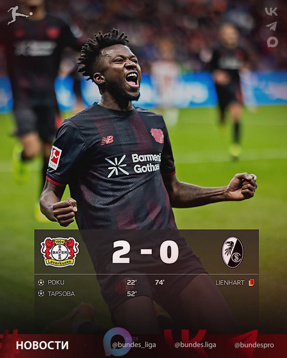 #Бундеслига ⚽️ 8 тур. «Байер» - «Фрайбург» 2:0 ⚽️ 22' Эрнест Поку (1:0) ⚽️ 52' Эдмон Тапсоба (2:0) ⚡️ «Байер» - четвертый в таблице Бундеслиги после 8 туров с 17-ю очками, команда «Фрайбург» имеет 9 очков и находится на - 11-й строчке. В 9 туре леверкузенцы едут в Мюнхен к «Баварии», а футболисты «Фрайбурга» будут гостить в Берлине у «Униона». ⭐️ MAX /// Видео+ ❤ Телеграм /// Аналитика+ ✅️ Флагманская /// Новости+
