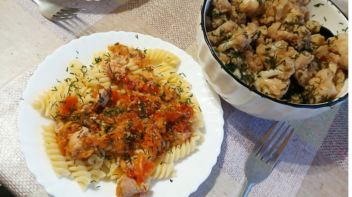 Вот реально я потратила на приготовление ужина не больше 25 минут. Всё делала одновременно, все конфорки сразу пыхтели. И вот что наготовила.