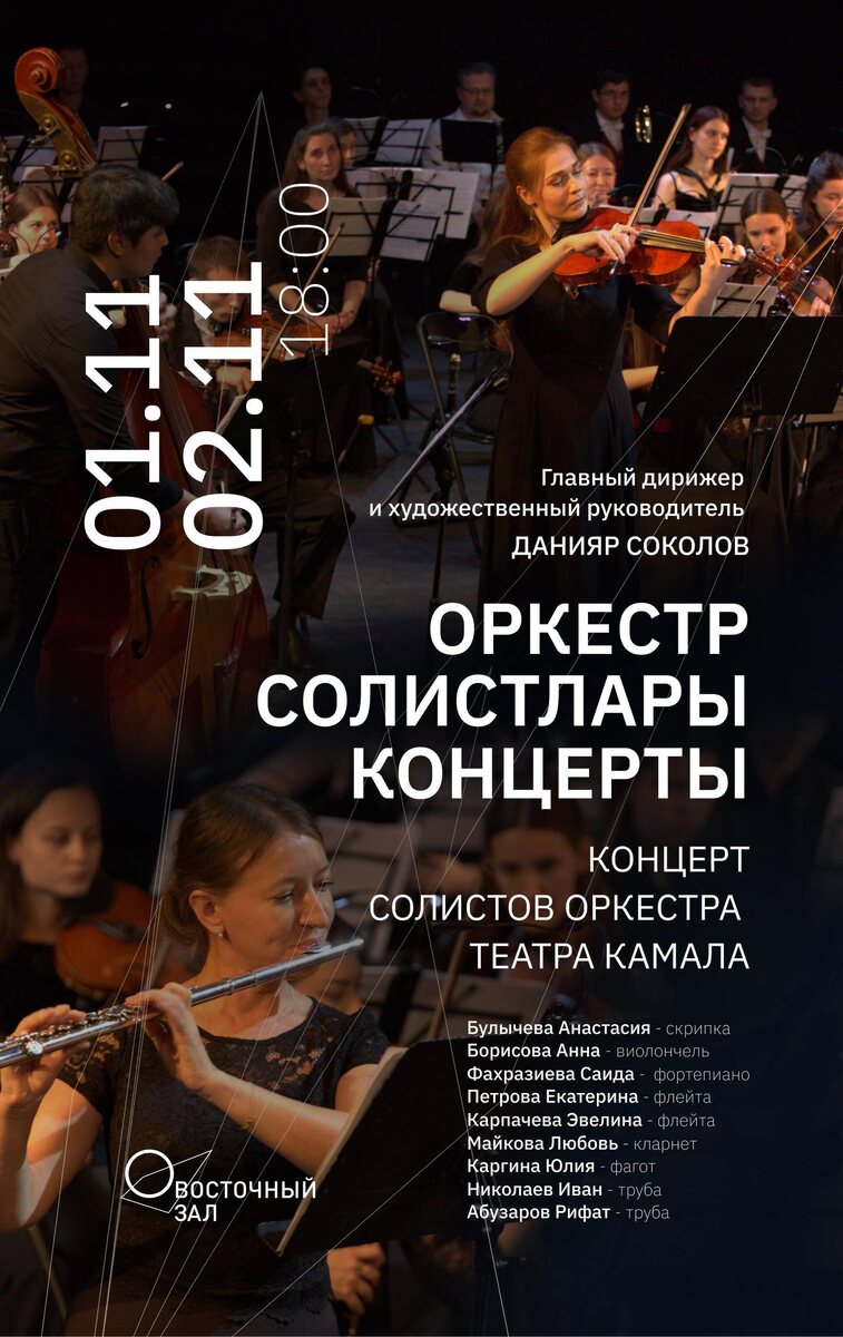 1 и 2 ноября концерт солистов оркестра театра Камала! Главными действующими лицами становятся сами артисты оркестра, выступающие как солисты с оркестром, тем самым раскрывая свою индивидуальность и мастерство. В программе: * Р. А. Еникеев - Концерт-поэма для скрипки с оркестром. Исполняет Булычева Анастасия. * Р. А. Еникеев - «Размышление» памяти Баки Урманче, для виолончели с оркестром. Исполняет Борисова Анна. * Л. И. Блинов - хореографическая сюита «Флорентийские витражи» для флейты, клавесина и струнного оркестра. Флейта - Петрова Екатерина, клавесин - Фахразиева Саида. * В. А. Моцарт - увертюра к опере «Свадьба Фигаро». * В. А. Моцарт - концерт для фагота с оркестром (B-dur). Исполняет Каргина Юлия. * А. Вивальди - концерт для двух труб с оркестром. Исполняют Николаев Иван и Абузаров Рифат. * М. Равель - «Каддиш». Исполняет Майкова Любовь. * К. Нильсен - концерт для флейты с оркестром, 1 часть. Исполняет Карпачева Эвелина. Главный дирижер и художественный руководитель - Данияр С