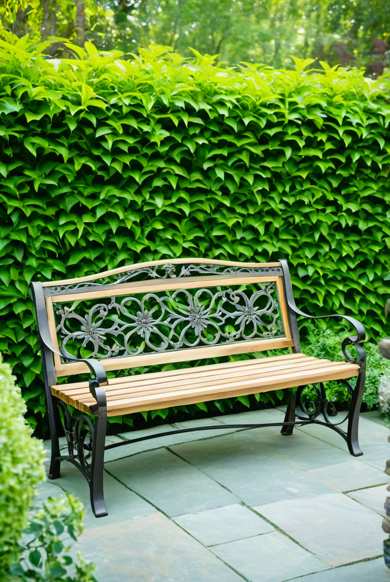 Q: Какой стиль сада лучше всего сочетается с кованой металлической скамьей?