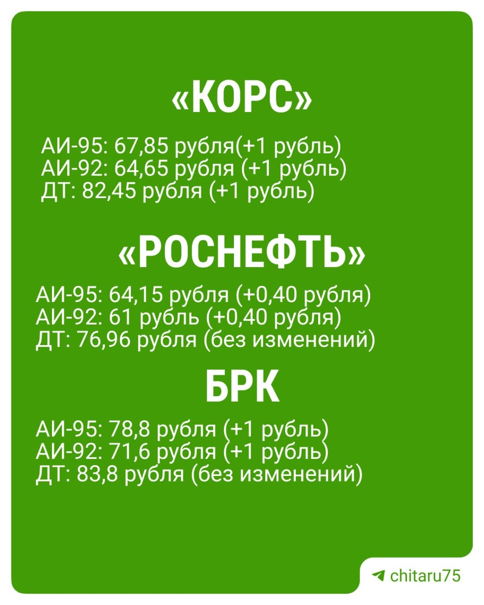Каждую неделю стоимость топлива в городе ползет вверх. По данным Банка России, рост цен связан с ремонтом нескольких нефтеперерабатывающих заводов. Сети АЗС закупают топливо из более отдалённых регионов, поэтому увеличиваются сроки поставок и себестоимость. Из-за этого в августе 2025 года бензин в Забайкалье подорожал на 8,66%, а за год — на 14,45%. 🔖Данные по «Корсу» и БРК взяты с «Яндекс Карт», по «Роснефти» — с сайта компании. ⏹ Подписаться на «Чита.Ру» в МАХ