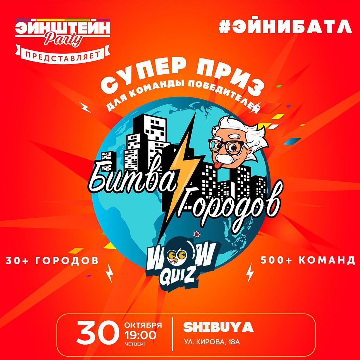 Квизы от WOW Quiz #Вечером Битва ⚡️ городов 30.10 | 19:00 | 600 руб. SHIBUYA, Кирова, 18 блок А +79142700028 Мы снова запускаем международную Битву Городов! MIX-формат снова зовёт за игровые столы, готовый смешать, но не взбалтывать! Результаты будут объединяться в общую таблицу городов Эйнштейн Party и победители получат подарки! С нетерпением ждём всех ценителей элегантного смешения наших топовых механик игры: классики, FUN’а, Пой.Танцуй.Люби и Без букв! Без букв 31.10 | 19:00 | 600 руб. Barmeister, Кирова, 18А +79142700028 Ждём всех на уникальной мультимедийной игре, где вы сможете взглянуть на привычные вещи под непривычным углом и без лишних слов попробовать угадать картину по её фрагменту, песню по эмодзи, предмет по снимку под микроскопом или фильм по стоп-кадру! Кинофан 1.11 | 19:00 | 600 руб. Barmeister, Кирова, 18А +79142700028 Вам предстоит угадывать кинокартины по кадрам, персонажей – по цитатам, актёров – по интересным фактам со съёмок, а режиссеров – по заслуженным