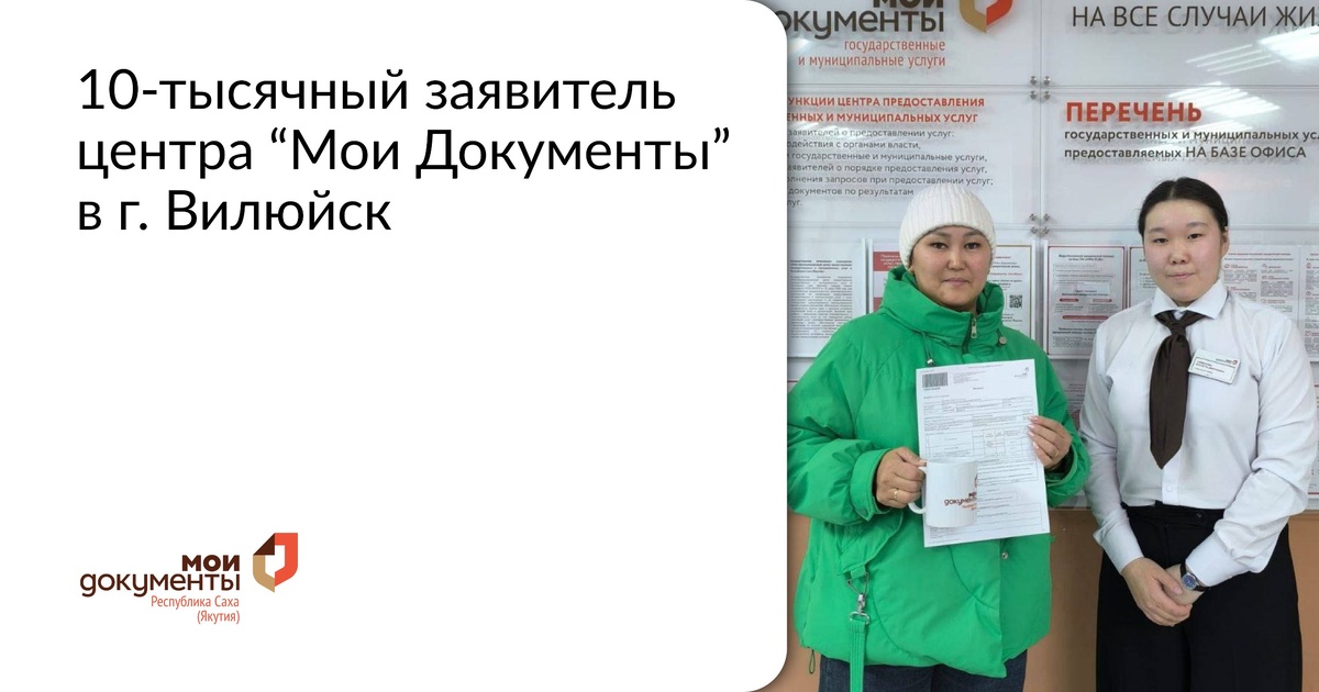 ✨Центр "Мои Документы" в г. Вилюйске достиг значимого рубежа — услугу получил 10-тысячный заявитель. Им оказалась жительница улуса Марианна Васильевна, обратившаяся для оформления регистрации права собственности на дом.