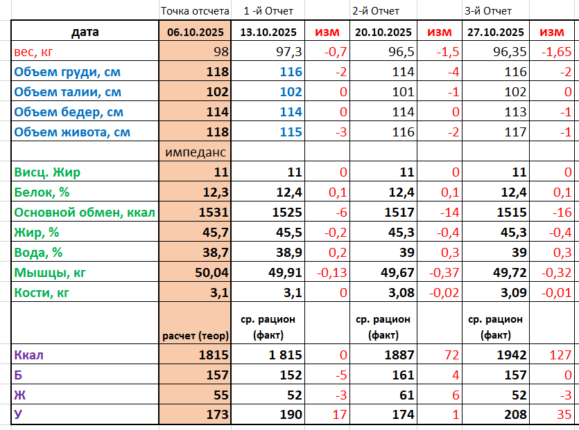 1) Динамика веса и состава тела 2) Замеры (антропометрия): 3) Питание: План: ~1815 ккал/день