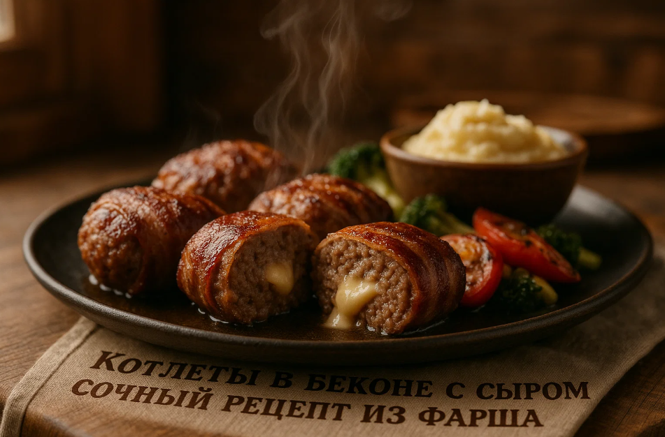 В классическом понимании котлеты — это что-то простое и привычное. Однако добавление бекона и сыра превращает обычное блюдо в нечто гораздо более изысканное. Бекон не только делает котлеты красивыми, но и выполняет важную технологическую роль: жир, который выделяется при запекании, пропитывает мясо, не давая ему пересохнуть. Сыр внутри, в свою очередь, создаёт нежную начинку, добавляя мягкости и кремовой текстуры.