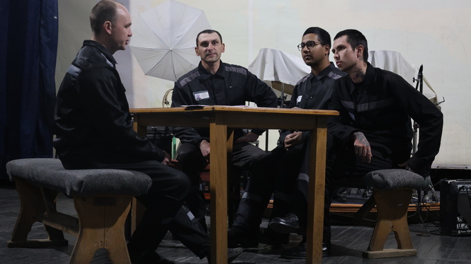 Во время репетиции заключенные ИК № 10 читают реплики по бумажке, где-то запинаются, но все же стараются играть, натурально показывать эмоции. Вокруг – вместительный темноватый актовый зал с сидушками-лавочками, как в старой электричке. В следующем году его обещают отремонтировать. Со стен смотрят нарисованные портреты Владимира Высоцкого, актеров Валерия Золотухина и Алексея Булдакова и самого Василия Шукшина. Здесь они – главные, культурные "надзиратели".