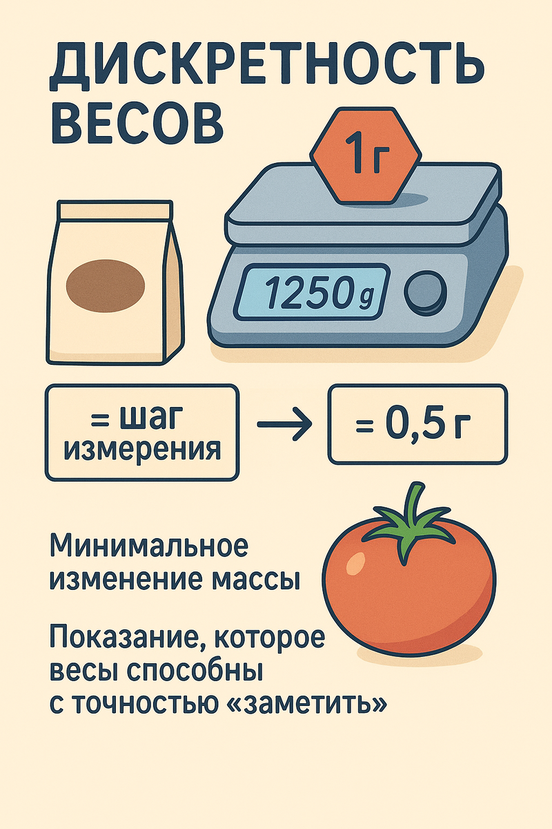 Дискретность весов — это минимальное изменение массы, которое прибор способен «заметить» и отобразить на экране. Другими словами, это шаг измерения.