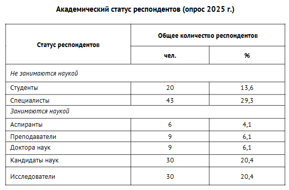 Исследование основано на специально разработанной анкете, направленной на изучение представлений о способах измерения научной продуктивности возможностями альтметрии. Опрос проводился среди широкой категории респондентов, включающей представителей различных профессиональных уровней: от студентов и аспирантов до преподавателей и докторов наук. Всего в опросе приняло участие 147 человек.