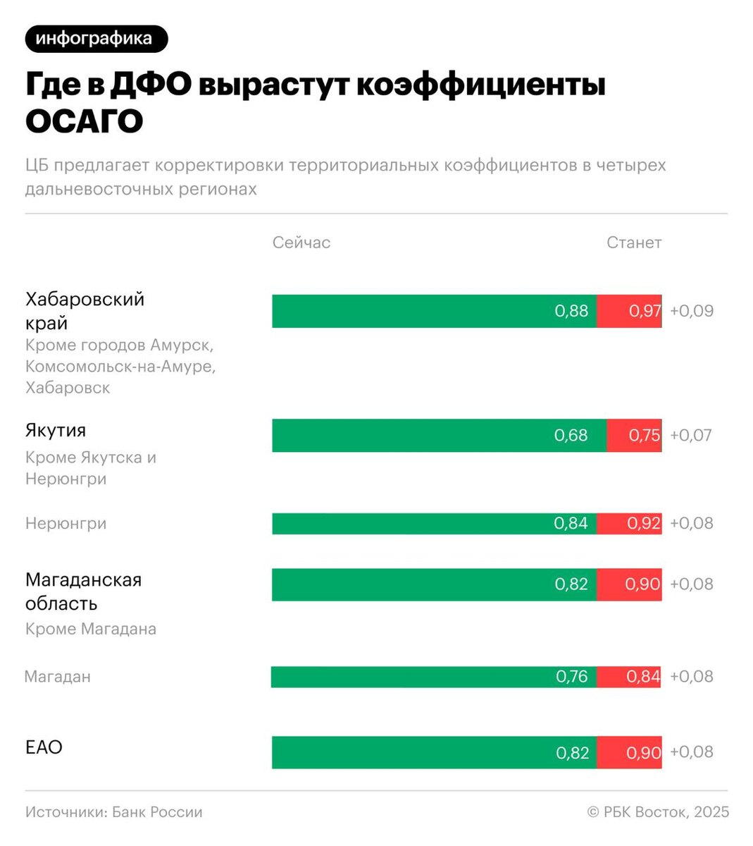 😀😀😀Банк России предлагает расширить коридор базовых ставок ОСАГО в обе стороны — стоимость полиса может как вырасти, так и уменьшиться на 40% для мотоциклов и на 15% для остальных транспортных средств Как пояснили РБК Восток в пресс-службе Дальневосточного ГУ Банка России, сейчас соответствующее указание регулятора находится на регистрации в Минюсте. В документе предусмотрены и корректировки территориальных коэффициентов, однако не для Приморского края. Регулятор указывает, что расширение тарифного коридора необходимо для сохранения справедливого ценообразования в условиях роста стоимости запчастей и размеров самих выплат. Из-за увеличения своих расходов страховщики будут вынуждены устанавливать стоимость полиса ближе к верхней границе тарифа. Если границы допустимых тарифов расширят, то водителям в повышенной зоне риска придется платить больше, зато из-за них уже не будут переплачивать более аккуратные автомобилисты — такова основная идея, стоящая за изменением границ тарифов.