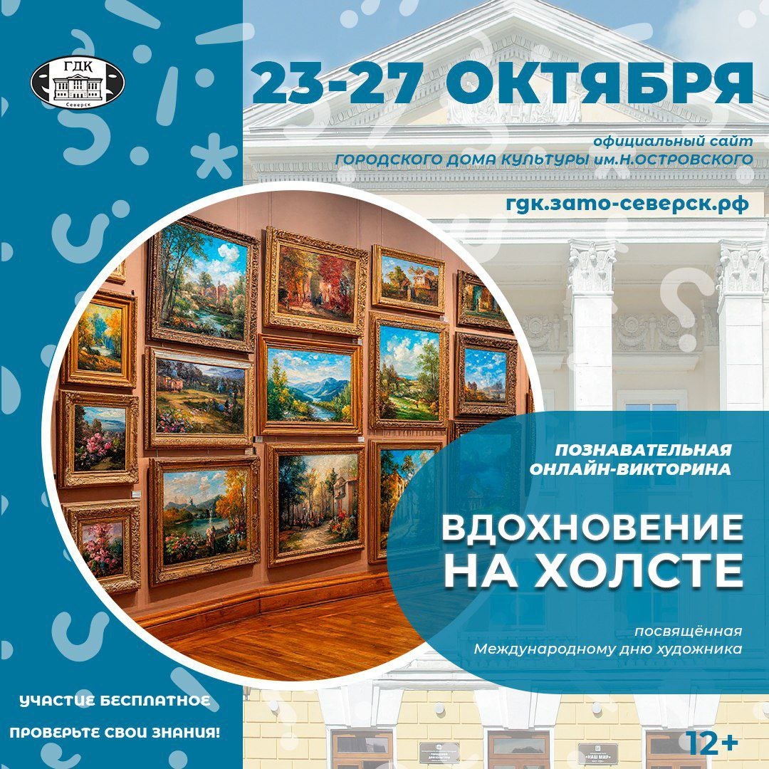 Онлайн-викторина «Вдохновение на холсте» 25 октября отмечается Международный день художника. Этот знаменательный день, посвященный труду и таланту всех художников по всему миру. Праздник был учрежден в 1996 году Международным арт-фондом в честь 152-летия со дня рождения великого испанского художника Пабло Пикассо. К этому знаковому событию дом культуры подготовил викторину «Вдохновение на холсте». У вас есть уникальная возможность проверить свои знания о знаменитых картинах Третьяковской галереи и узнать много интересного! Викторина доступна для прохождения на сайте https://гдк.зато-северск.рф/poznavatelnaja-onlajn-viktorina-vdohnovenie-na-holste https://гдк.зато-северск.рф/poznavatelnaja-onlajn-viktorina-vdohnovenie-na-holste