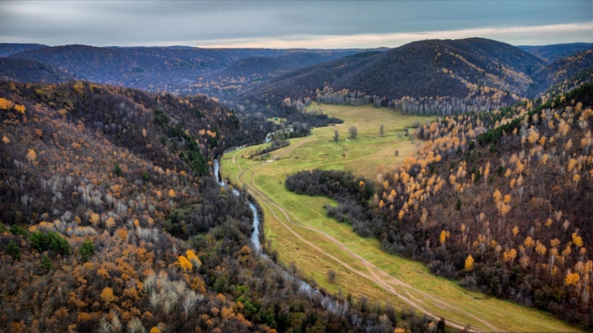 Чарующий вид открывается с высоты птичьего полёта на Гумеровское ущелье. Осень разодела деревья в разноцветные наряды, оттого лесистые холмы выглядят необычно и красиво. Внизу голубой лентой бежит-смеётся река. И даже нахмуренное небо не портит общей картины, а придаёт ей суровой величественности. Всем прекрасного дня!