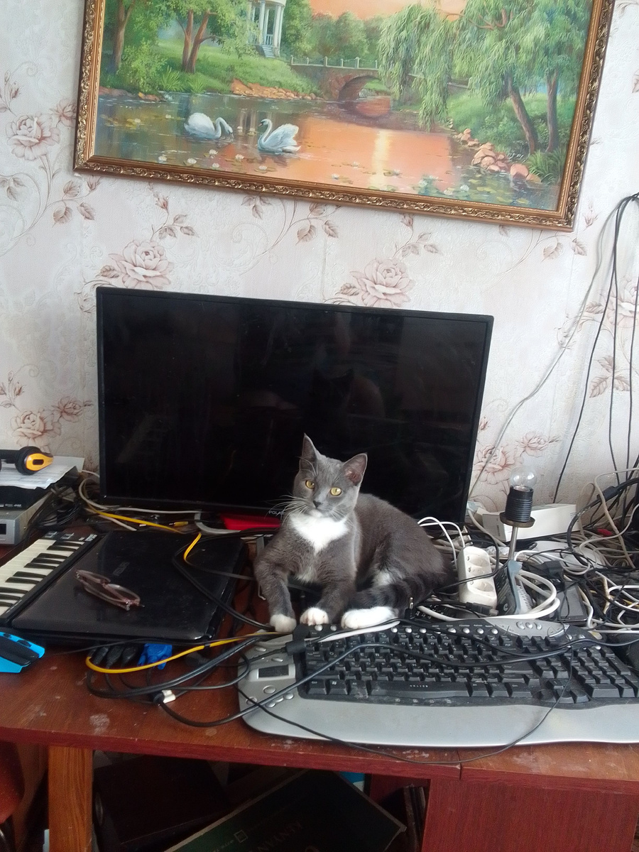 В тот вечер Серж как всигда пришел с работы. И перрвым делом стал разбирать и ставить кампьютеур. Кампьютеуррр у Сержа не прастой, к мяутбуку прилагается некая каробка нибальших размеров под названием звуковая карта. Серж первым делом присаидинил эту каробку к компьютеру правадком с квадратными концами под названием юэсби, а затем к звуковой карте падключил калонки динамики, микрафон и нибальшой синтезатор. Затем Серж зачем то соидинил снова звуковую карту с кампьютеурром звуковым проводом, присоидинил к кампьютеурру наушники, падключил тиливизор к кампютеурру бальшим жирным проводом и зачем то есче крохотный синтезатор, на катором и играть невазможна. Этот крохотный синтезатор Серж назвал мидиклава. Подключив питание, Серж ушел на кухню и я знаю зачем. Вскоре Серж вынес восемь мисок с мяусом куррицы и раздал нам восьми талантливым кошкам и катам. Но, дав нам, кошкам и катам мяусо куррицы, Серж не пошел на кухню кушать сам и даже не стал сматреть на то как мы кушаем. Серж аткрыл крышку