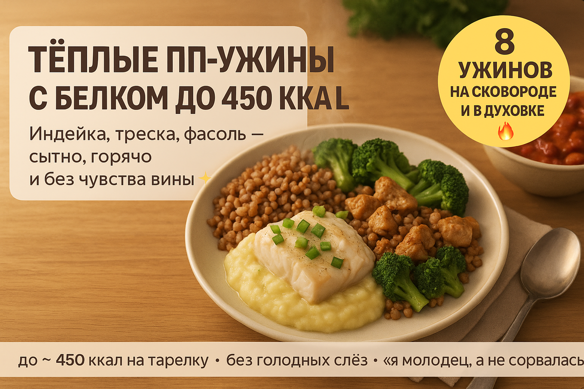 🔥 Превью (жми и сохраняй себе): 8 быстрых ужинов на сковороде и в духовке с нормальным белком и без голодных слёз — индейка, треска, фасоль. Всё до ~450 ккал на большую тёплую тарелку.🔥