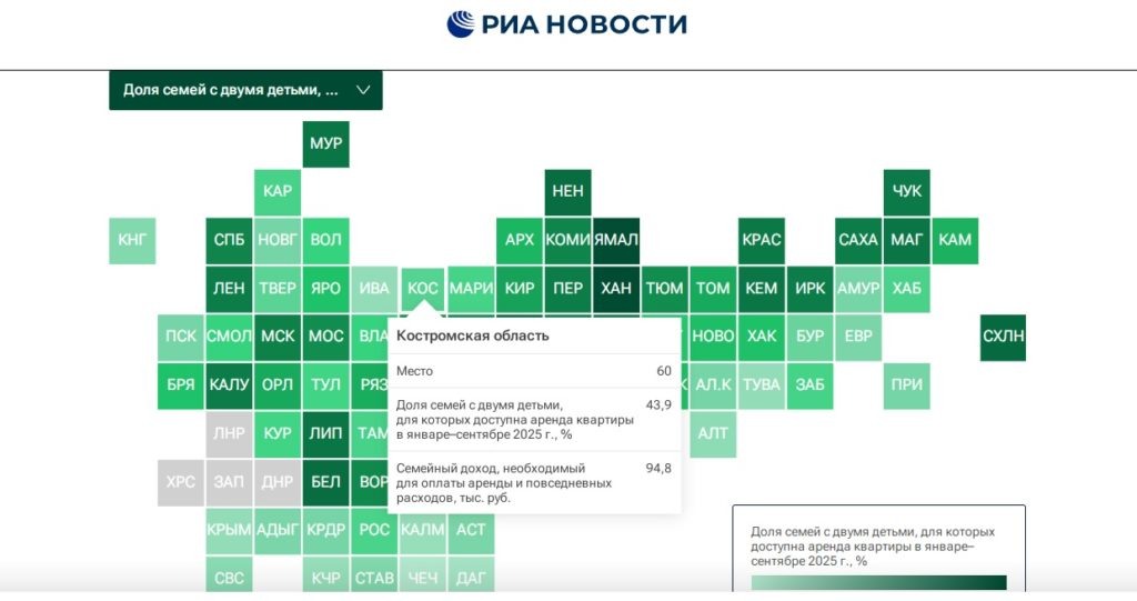 Регион занимает 60 место в рейтинге по доступности аренды жилья, стало известно Logos44.ru. Костромская область заняла 60 место из 85 в рейтинге доступности аренды жилья. Данные приводит издание РИА Новости. Согласно исследованию, в 2025 году доля семей с двумя детьми, для которых доступна съемная квартира, составляет 43,9%. А семейный доход на оплату аренды и ежедневные бытовые траты должен составлять почти 95 тысяч рублей. Для сравнения, соседняя Ярославская область занимает 42 место, там съемное жилье доступно почти половине семей с детьми. В Ивановской области аренду может потянуть меньше трети семей, поэтому регион оказался на 77 строчке рейтинга. Исследователи также высчитали, что российские семьи тратят на съемное жилье почти 70% своего дохода. При анализе ситуации учитывались арендные ставки на жилье с января по сентябрь 2025 года, величина зарплаты и прожиточный минимум в регионе.