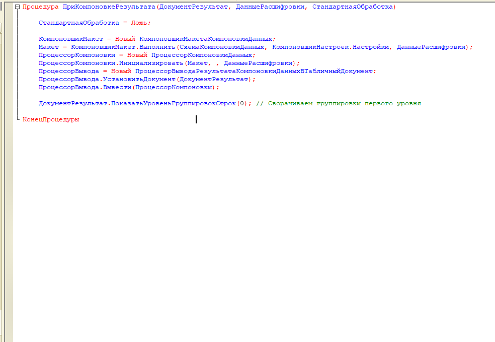 СтандартнаяОбработка = Ложь; КомпоновщикМакет = Новый КомпоновщикМакетаКомпоновкиДанных; Макет = КомпоновщикМакет.Выполнить(СхемаКомпоновкиДанных, КомпоновщикНастроек.Настройки, ДанныеРасшифровки); ПроцессорКомпоновки = Новый ПроцессорКомпоновкиДанных; ПроцессорКомпоновки.Инициализировать(Макет, , ДанныеРасшифровки); ПроцессорВывода = Новый ПроцессорВыводаРезультатаКомпоновкиДанныхВТабличныйДокумент; ПроцессорВывода.УстановитьДокумент(ДокументРезультат); ПроцессорВывода.Вывести(ПроцессорКомпоновки);