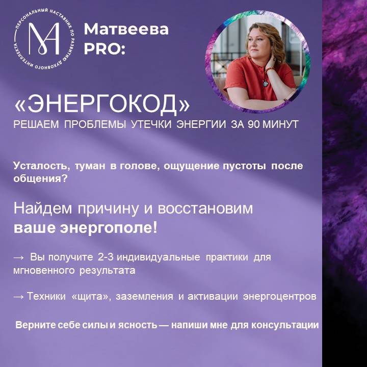 Постоянно нет сил? Решаем проблему в корне за 90 минут! Знакомо состояние, когда энергия утекает сквозь пальцы? Вы просыпаетесь уже уставшим, не можете сосредоточиться, а после общения с людьми чувствуете себя опустошенным. Обычные советы «больше отдыхать» или «взять себя в руки» не работают! Почему? Потому что причина — не в лени или плохом характере. Она в нарушении вашей энергетической системы. Консультация «ЭНЕРГОКОД» — это не разговор о проблеме, а её прямое решение. Мы находим «слабое звено» в вашем энергополе и точечно его восстанавливаем. Как это работает на практике? Допустим, ваш запрос: «после работы — как выжатый лимон, хотя ничего особенного не делал». Во время сессии я, как диагност, нахожу причину этой утечки. Часто ею оказывается неосознанное подключение к энергополю коллег или семьи. Вы постоянно «тащите» на себе их эмоциональный фон, а своему телу не оставляете ничего. Я не просто расскажу вам об этом, а: 1️⃣ Проведу точную диагностику и найду, куда именно уте